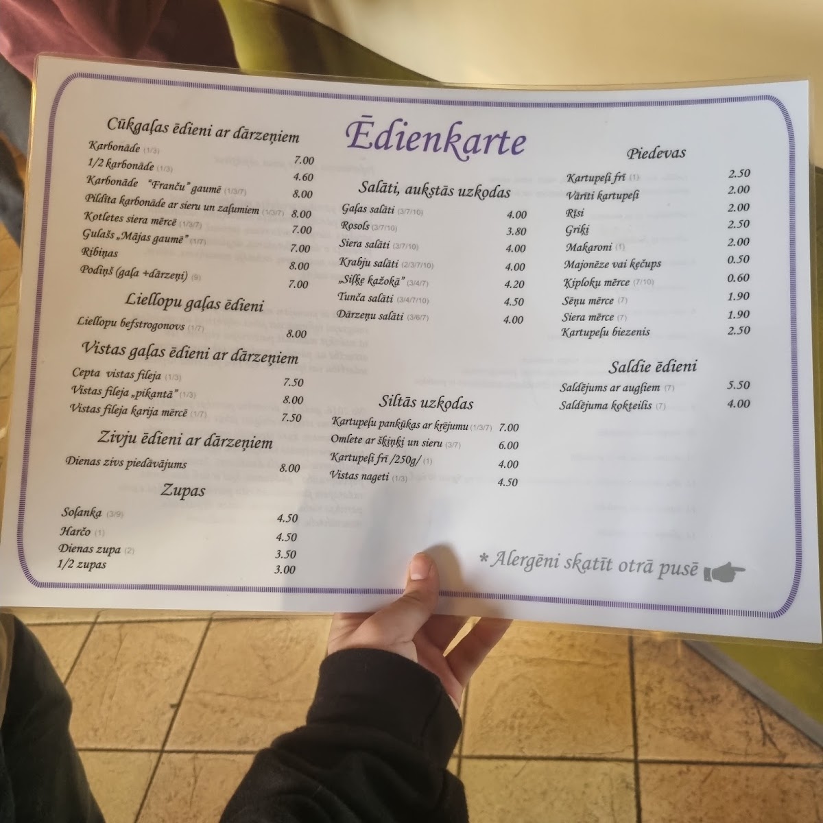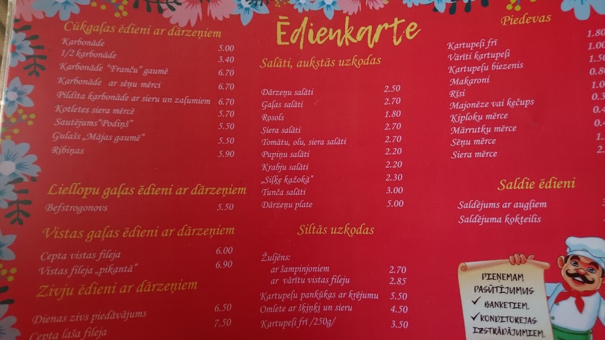 Guests can enjoy warming soups like Холодный Суп or the hearty Солянка, typically savored as a satisfying start on cooler days or a cozy midday break. For something more filling, the menu includes dishes like Karbonāde Ar Fri Kartupeļiem and Vistas Šašliks, which are easygoing options for a relaxed lunch or dinner with friends and family.